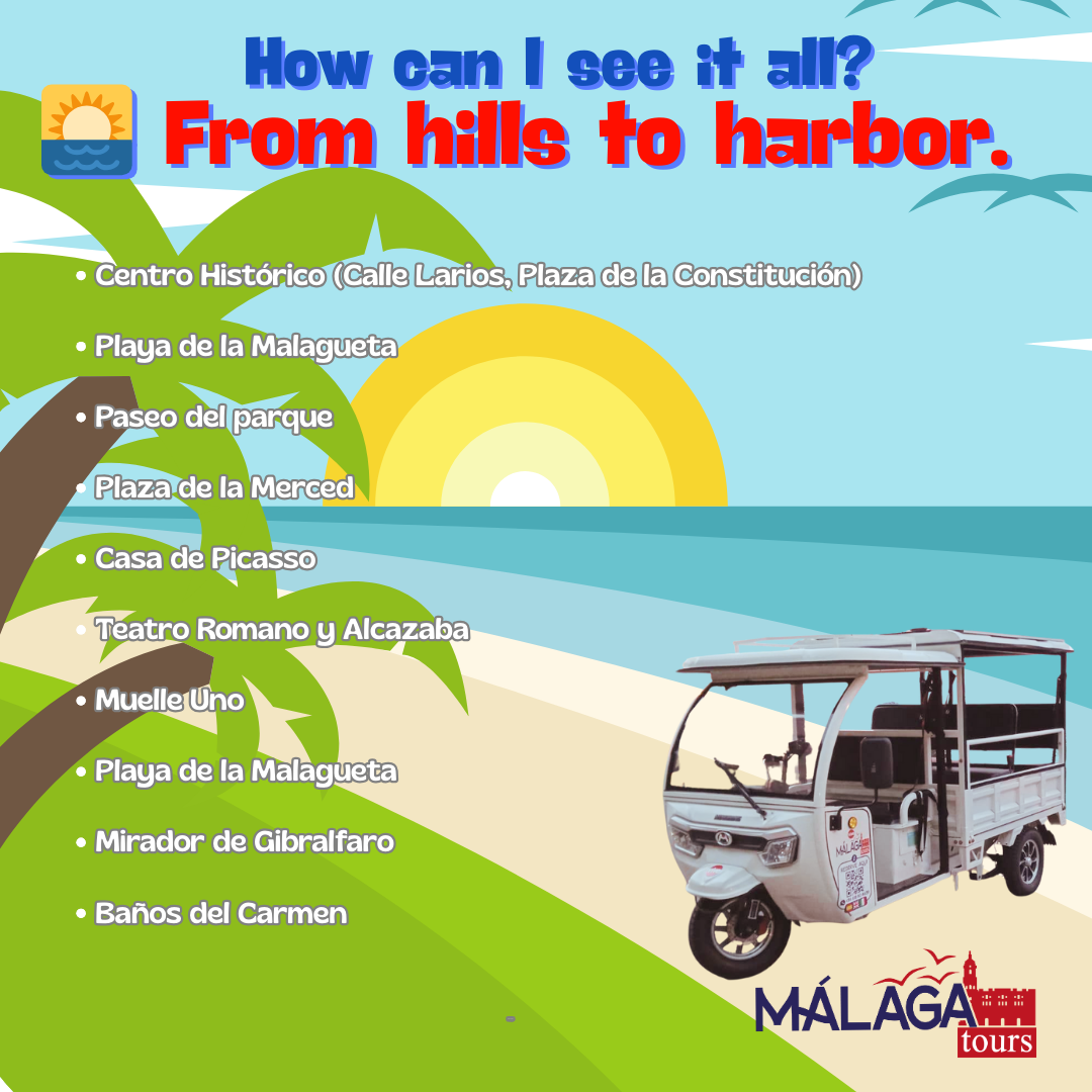 A perfect mix of history and landscapes: 🏛 Historic center, 🏰 Alcazaba, 🎭 Roman Theatre, 🌊 coastline, 🏯 Gibralfaro Castle, Picasso's House , Paseo del Parque and 🌅 breathtaking panoramic spots.