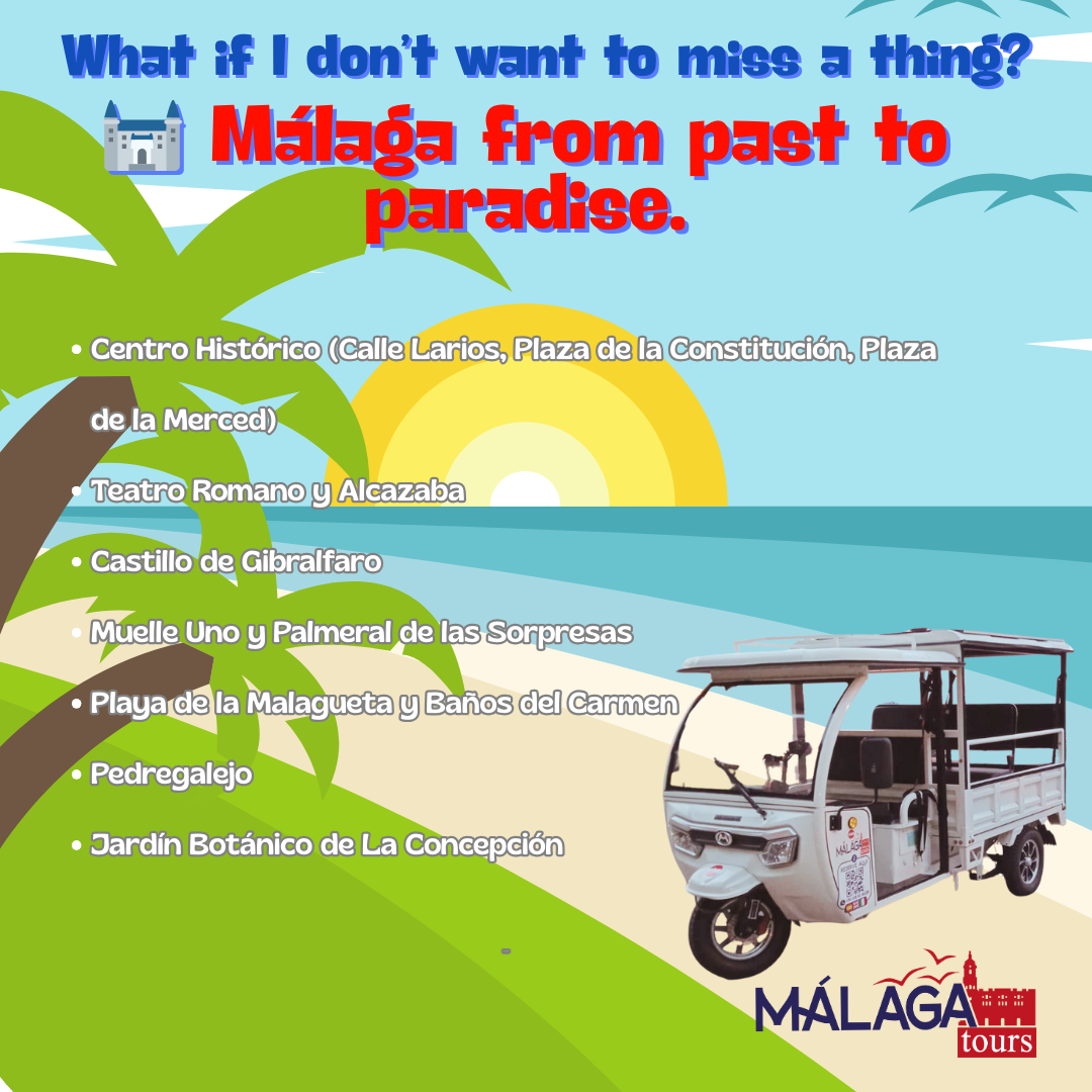 The full Málaga experience: 🏛 Historic center, 🏰 Alcazaba, 🎭 Roman Theatre, ⛪ Cathedral area, 🏖 Malagueta Beach, 🚤 Muelle Uno, 🏯 Gibralfaro Castle, Picasso's House 🌊 coastal roads, and 🏘 charming hidden neighborhoods.